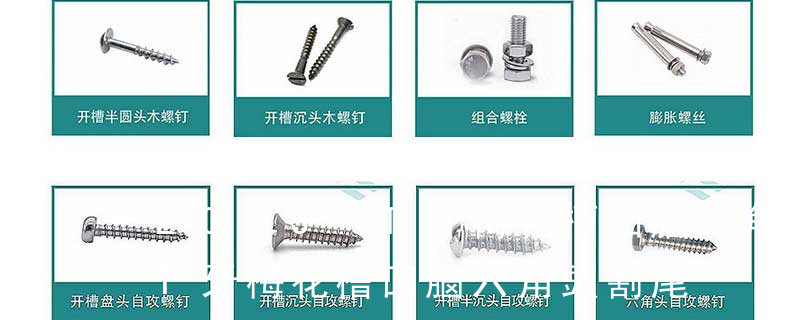 主要分類(lèi)包括普通螺絲、機(jī)螺絲、自攻螺絲和膨脹螺絲三種。有頭螺釘Cap screw 過(guò)去限于全牙的扣件。六角頭螺釘Hex cap screw與大六角螺栓Hex bolt 顧名思義為頭部為六角型的外螺紋扣件,設(shè)計(jì)為使用扳手轉(zhuǎn)動(dòng)。依照ASME B18.2. Phill 十字槽Serra-tion 墊下帶花Flower Head 開(kāi)花頭6-bobes recess 內(nèi)梅花Piston bolt 活塞螺釘Winding bolt 線圈螺釘Hexagon head bolts-full thread 六角頭螺栓 全螺紋Carriage bolt 馬車(chē)螺栓Square head bolt-product grade C 方頭