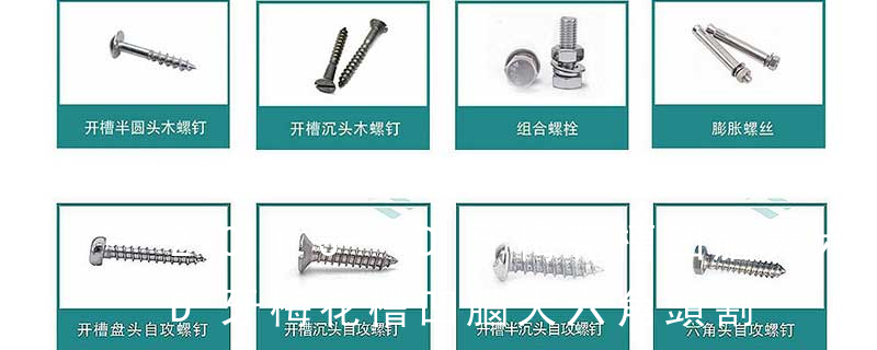 ANSI/ASME B1.7M-1984(R2001)版 螺紋的術(shù)語、定義和字母符號 ASME B1.8-1988(R1994)版 矮牙愛克母螺紋 ASME B1.12-1987(R1998)版 5級過盈配合螺紋 ASME B1.13M-2005版 M形米制螺紋 ANSI/ASME B1.20.1-1983(R2001)版 通用 1.機螺釘 2.自攻螺釘 3.鉆尾螺釘 4.墻板釘 5.纖維板釘 6.木螺釘7.六角木螺釘 8.不脫出螺釘 9.組合螺釘 10.微型螺釘 11.家具螺釘 12.電子螺釘頭型:1.六角頭(hexagon head) 2.六角頭法蘭面(hexagon head with flange) 3.